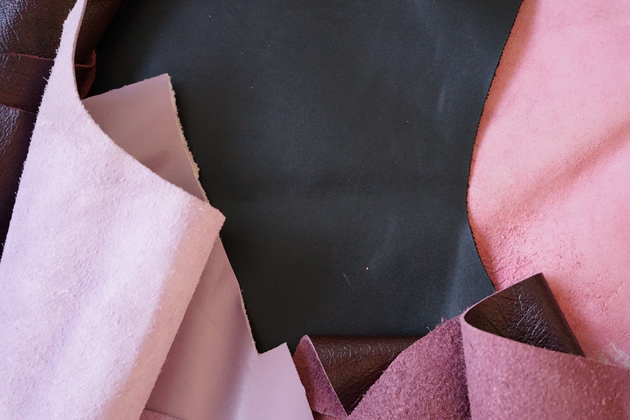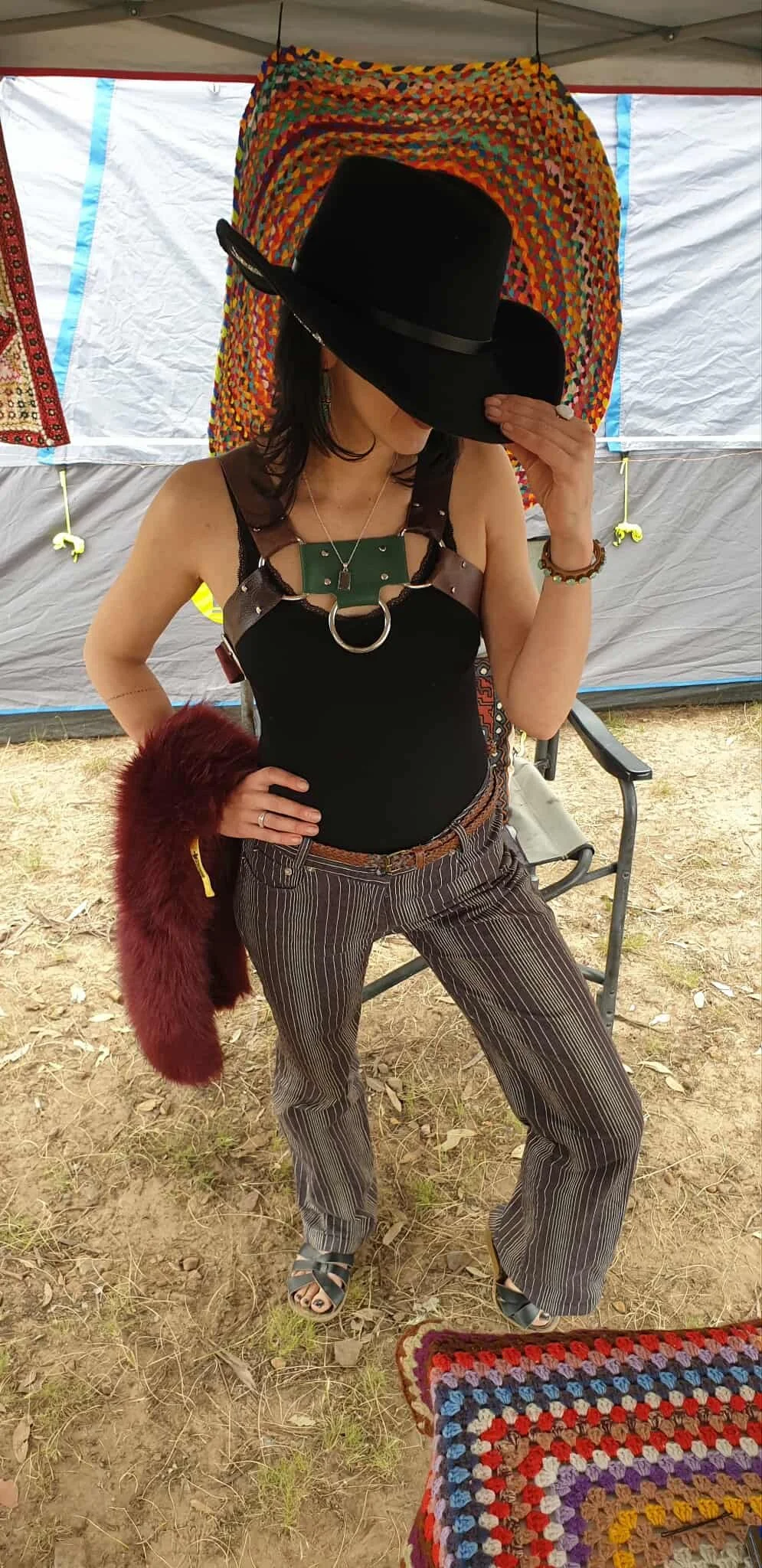 Person wearing a black leather harness with a large decorative flower concho over a grey ribbed crop top, lit by pink light.